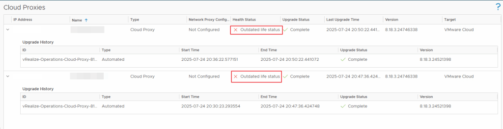 Recently we came across an issue where the cloud proxies in our VROPS version 8.18.3 showed their health as outdated health status.